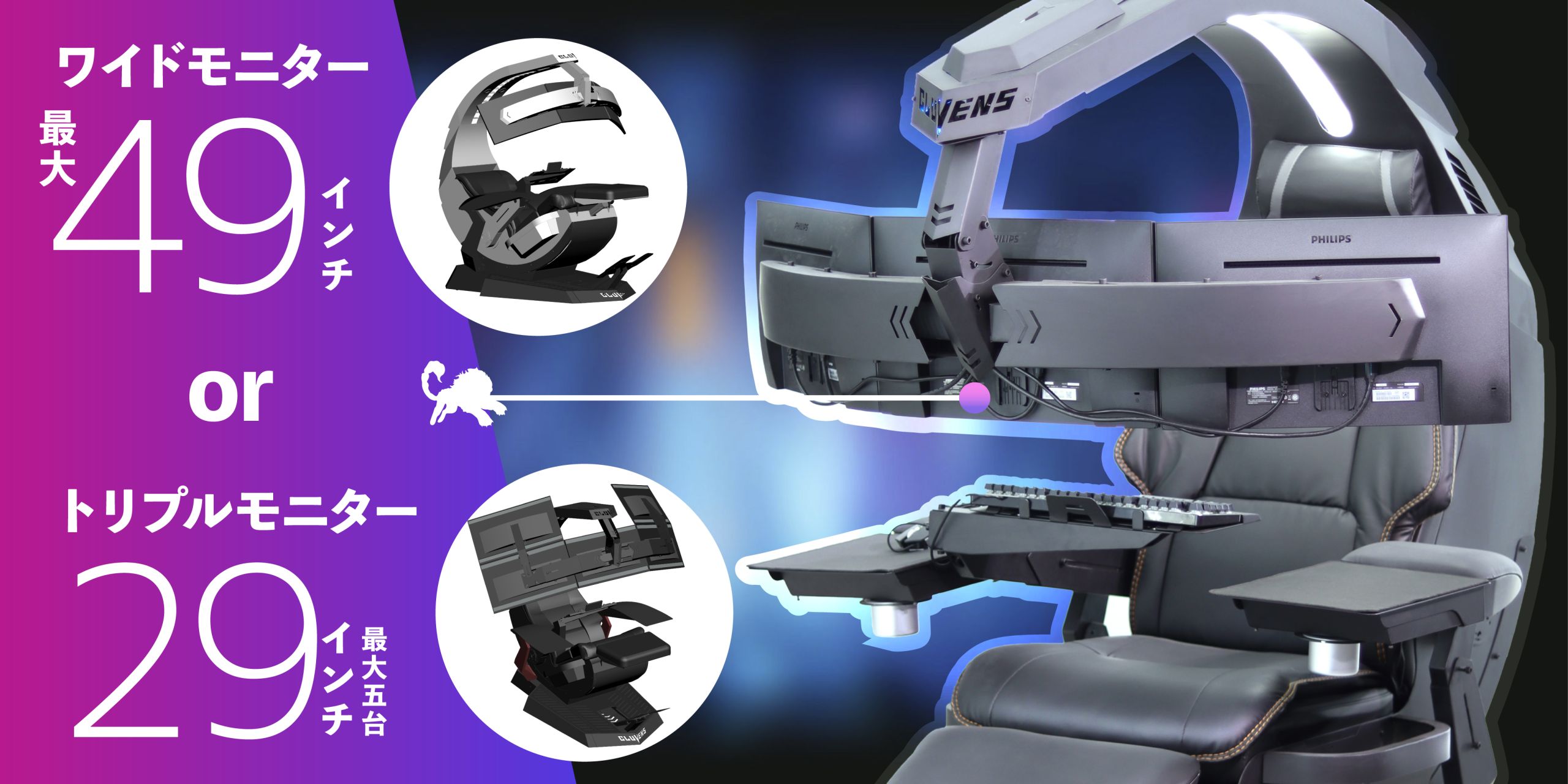 ScorpTokyo ICHIは、あなたのゲームスタイルに合わせて、最大49インチのモニター1台、もしくは29インチ以下のモニター3台〜5台を設置可能です。