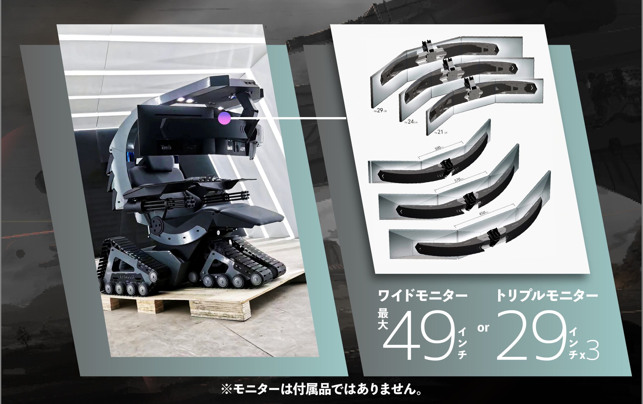 モニターは最大三台まで設置が可能で、34インチのモニターまで対応可能!さらに延長できるブラケットも追加できます。不要な時はしまうことができ、視界もすっきりするので邪魔になりません。
